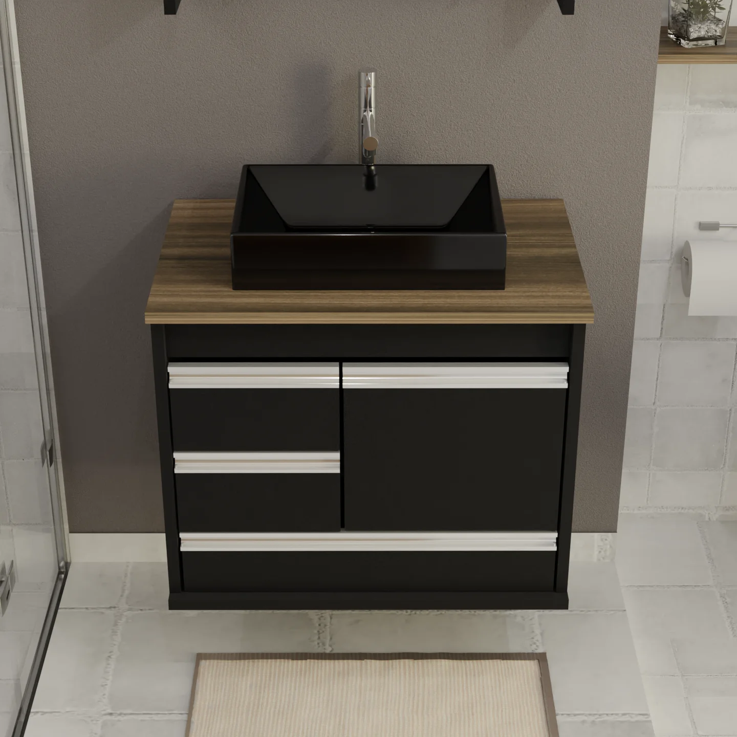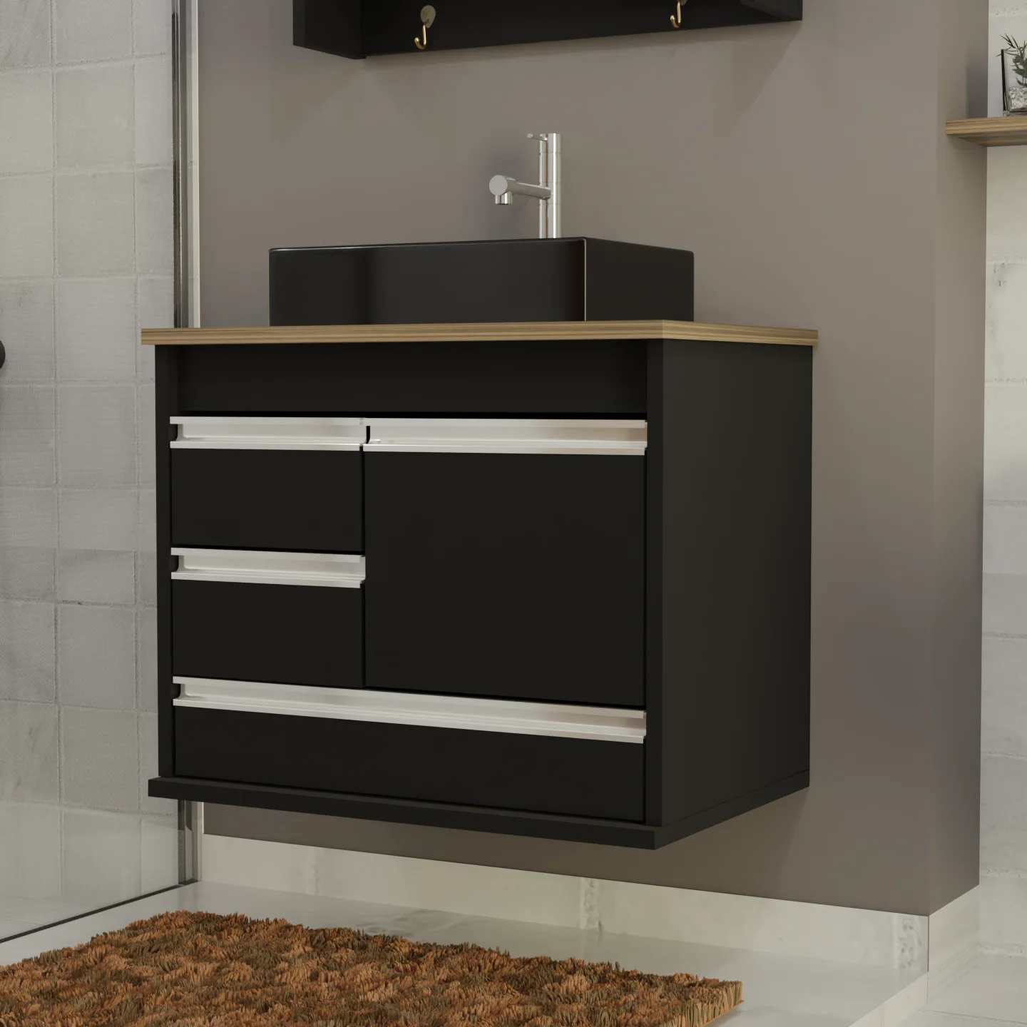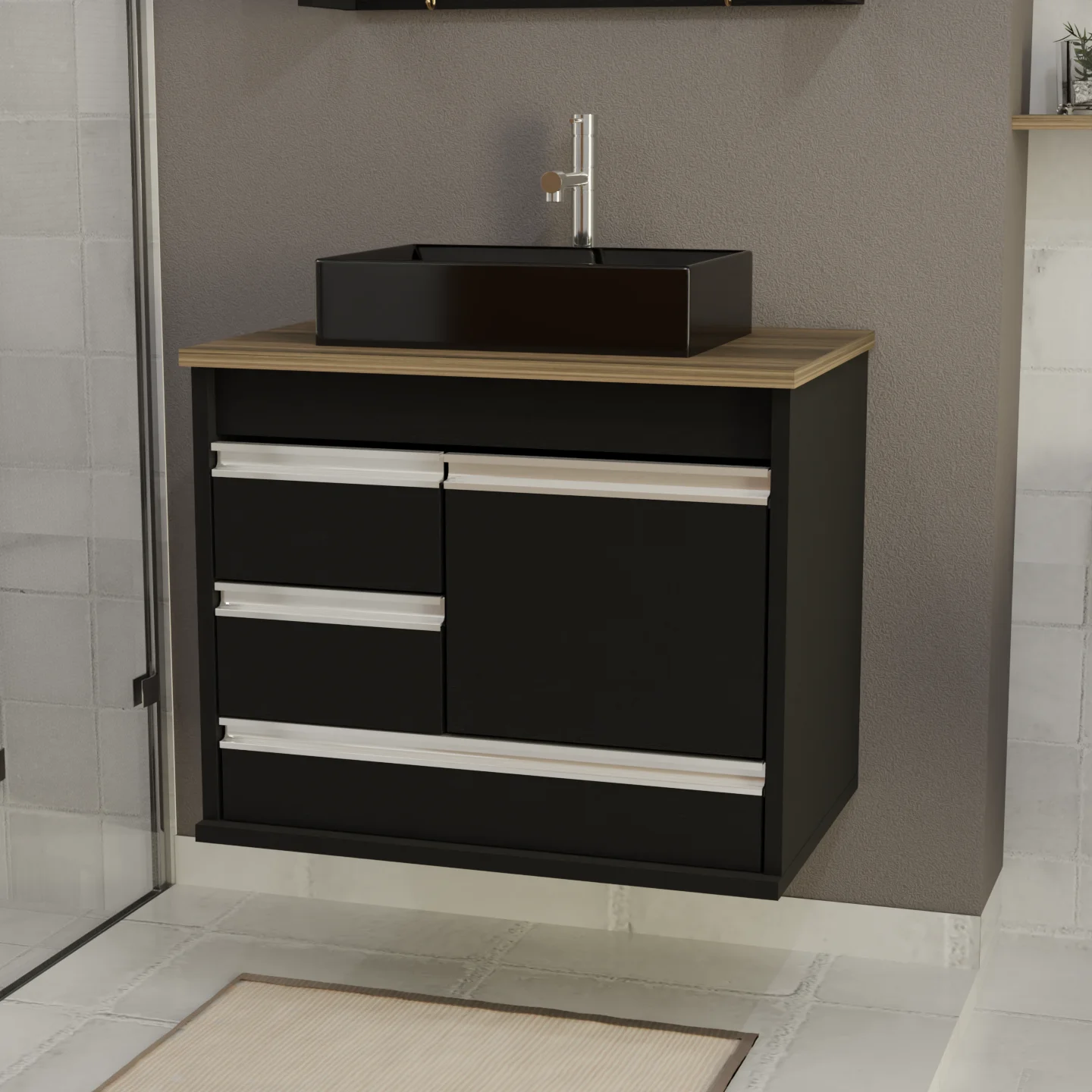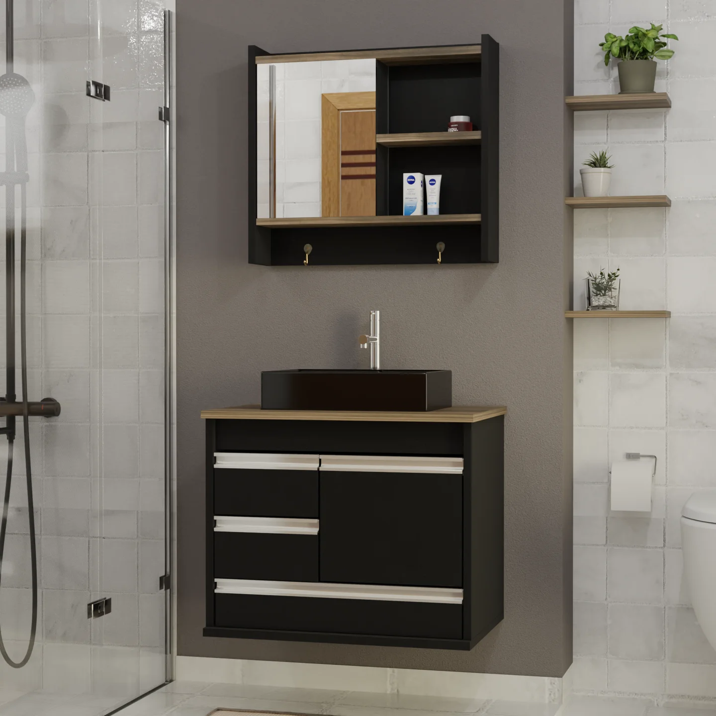 O Gabinete de Banheiro Arezzo com acabamento fosco é a escolha perfeita para quem deseja unir modernidade, sofisticação e praticidade. Com uma combinação elegante de preto e amadeirado, ele traz um visual contemporâneo que se adapta a diversos estilos de decoração, sendo ideal para banheiros de todos os tamanhos.